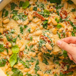 This Creamy Spinach & Sun-Dried Tomato Stewed Butter Beans recipe transforms humble ingredients into something deeply comforting and full of flavor. With a rich, creamy sauce and perfectly tender beans, this vegetarian dish works just as well as a filling main as it does as a side dish or appetizer served with crusty bread.