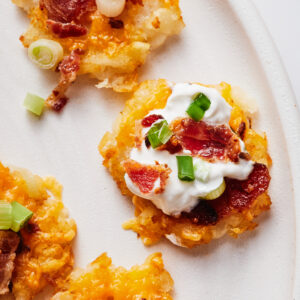These Smashed Loaded Tater Tots are crispy on the outside, soft on the inside, and piled high with crispy bacon and melty cheese. They’re the ultimate crowd-pleasing snack; perfect for game day, parties, or a fun after-school snack.