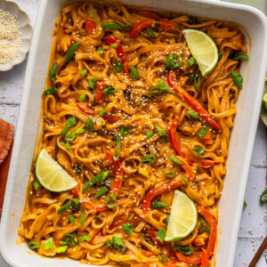 This One-Pan Red Thai Curry Noodles dish is almost foolproof to make, simply add everything to a baking dish and bake. The noodles soak up the deliciously rich curry sauce as they cook and the veggies become tender. This is the perfect low effort meal for busy weeknights that your whole family will love.