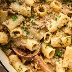 This Ragù Bianco (aka White Bolognese) is a rich and savory twist on traditional bolognese, made without tomatoes and slow-cooked to perfection with white wine, aromatic herbs, and a creamy base. Tender ground meat and vegetables give it a hearty flavor, making it a comforting and elegant sauce perfect for date night or to impress a crowd.