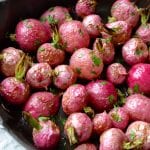 Toss the radishes in the olive oil, salt and pepper. Lay them out evenly cut side down on a baking sheet or in a cast iron skillet ensuring that they are in a single layer.